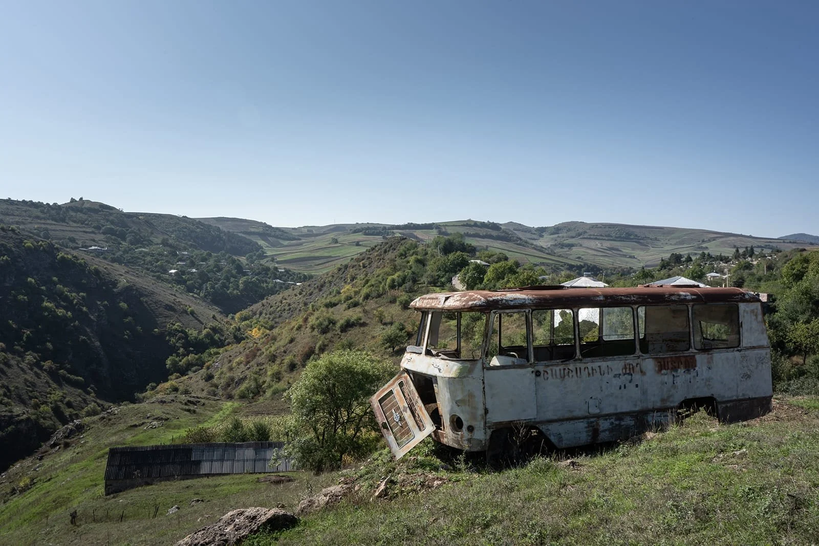 Destroyed vehicles dot the landscape along the Armenia-Azerbaijan border. This bus from Soviet times has been sitting for decades on this hill, close to the Armenian village of Movses, a silent witness to the stalemated conflict.